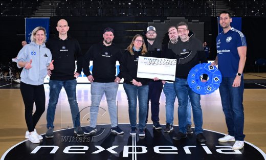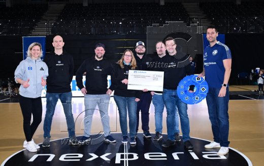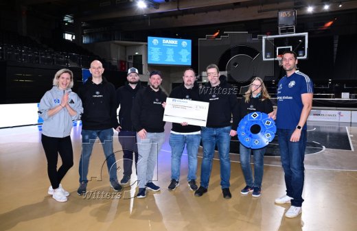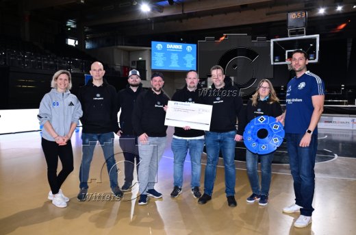 Scheckuebergabe der HSV-Lotsen an die BG Baskets Hamburg mit Laura Ludwig (Vizepraesidentin, HSV e.V., l.) und David Schulze (Koordinator BG Baskets, r.)