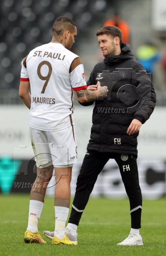 Schlussjubel v.l. Maurides, Trainer Fabian Huerzeler (St. Pauli)