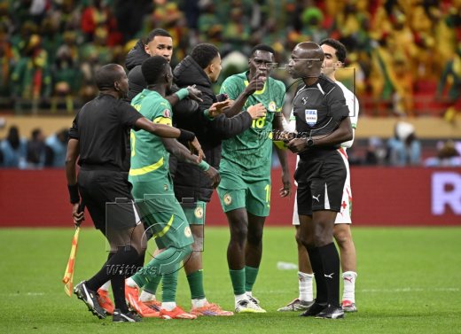 Mitte v.l. Ismaila Sarr (Senegal), Schiedsrichter Jean-Jacques Ndala Ngambo (DR Kongo) nach Elfmeterentscheidung gegen Senegal