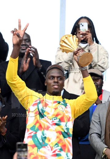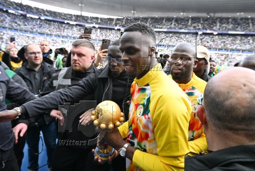 Torwart Edouard Mendy (Senegal) mit Pokal vom CAF Afrika-Cup 2025 in Marokko (annulliert, Marokko wurde zum Sieger erklaert)
