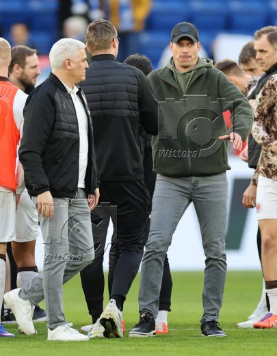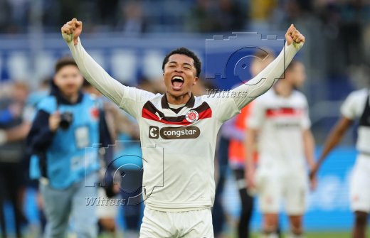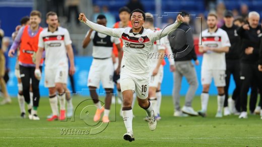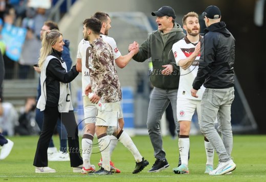 Schlussjubel v.l. Trainer Alexander Blessin (St. Pauli), Co-Trainer Peter Nemeth, Andreas Bornemann (Geschaeftsleiter Sport, St. Pauli)