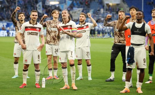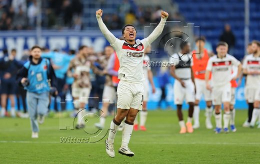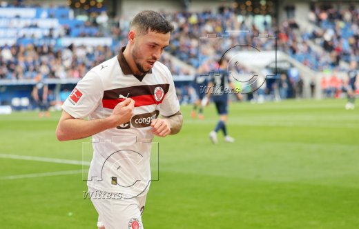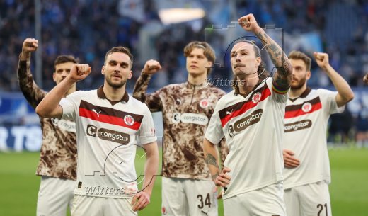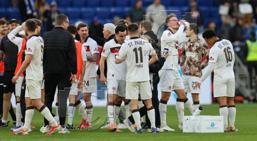 Schlussjubel v.l. Danel Sinani, James Sands, Trainer Alexander Blessin (St. Pauli), Lars Ritzka, Mannschaftsarzt Dr. Sebastian Schneider
