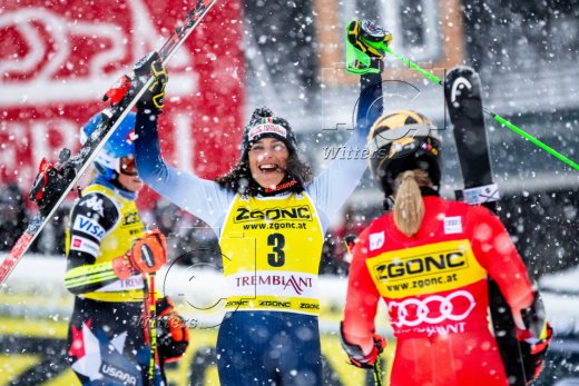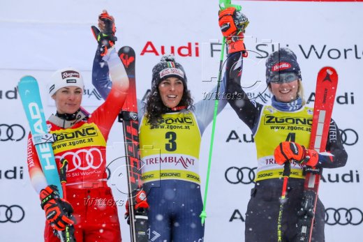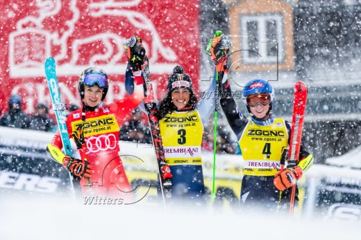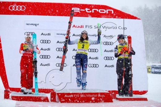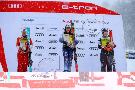 Siegerehrung v.l. Lara Gut-Behrami (Schweiz, 2. Platz), Siegerin Federica Brignone (Italien, 1. Platz), Mikaela Shiffrin (USA, 3. Platz)