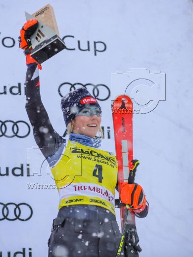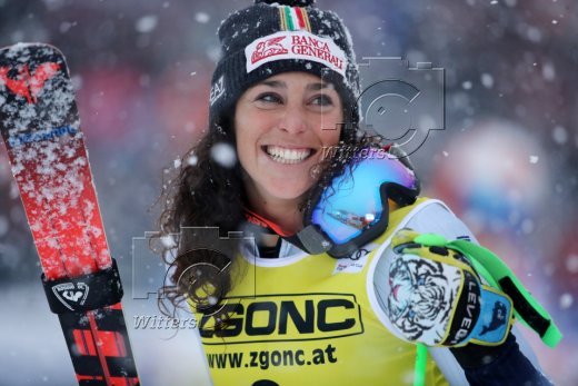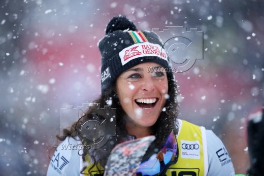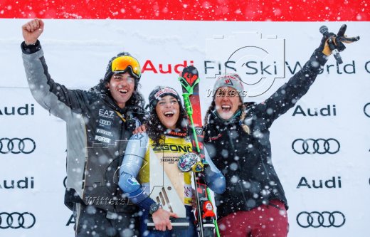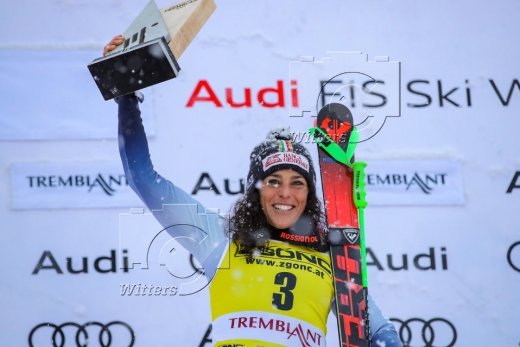v.l. Bruder und Trainer Davide Brignone, Siegerin Federica Brignone (Italien), Moderatorin Marie-Michele Gagnon (Kanada)