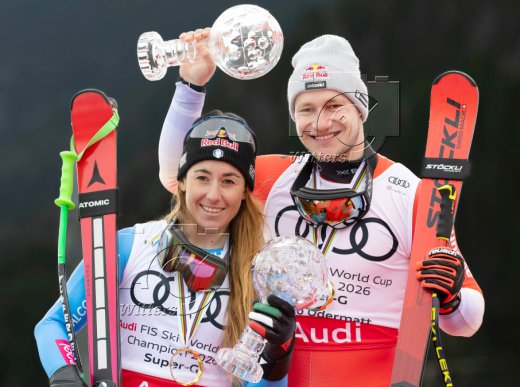 Weltcup-Gesamtsieg Super G, Gesamtsiegerin Sofia Goggia (Italien), Gesamtsieger Marco Odermatt (Schweiz) mit kleiner Kristallkugel
