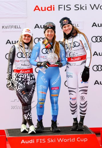 Siegerehrung Weltcup-Gesamtsieg Super G, v.l. Alice Robinson (Neuseeland, 2. Platz), Gesamtsiegerin Sofia Goggia (Italien) mit kleiner Kristallkugel, Emma Aicher (Deutschland, 3. Platz)