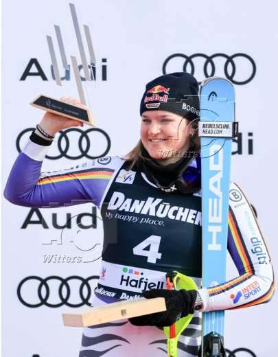 Siegerehrung Weltcup-Gesamtsieg Super G, v.l. Emma Aicher (Deutschland, 3. Platz)