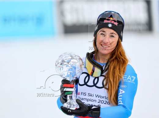 Laura Pirovano (Italien), Weltcup-Gesamtsiegerin Abfahrt, mit kleiner Kristallkugel