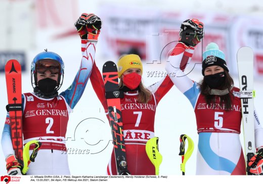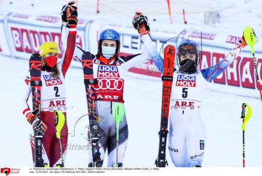 v.l. Mikaela Shiffrin (USA, 2. Platz), Siegerin Katharina Liensberger (Oesterreich), Wendy Holdener (Schweiz, 3. Platz)