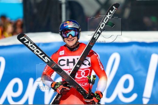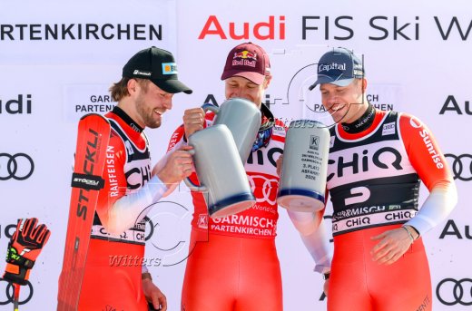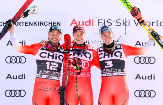 v.l. Alexis Monney (Schweiz, 2. Platz), Sieger Marco Odermatt (Schweiz), Stefan Rogentin (Schweiz, 3. Platz)