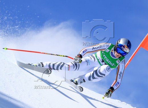 v.l. Nina Ortlieb (Oesterreich, 2. Platz), Siegerin Corinne Suter (Schweiz), Sofia Goggia (Italien, 3. Platz)