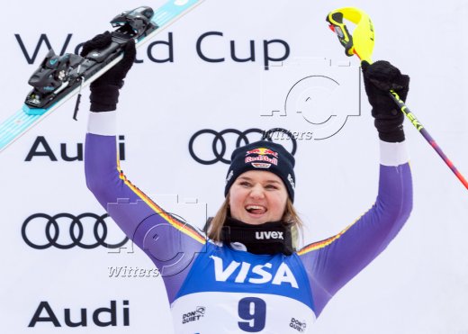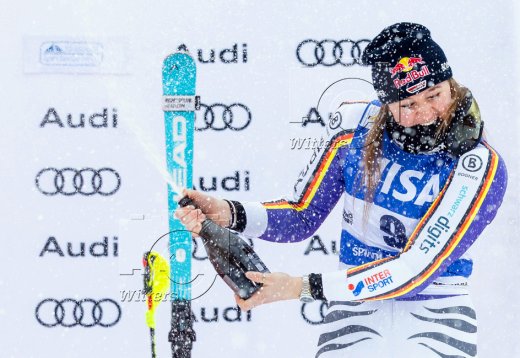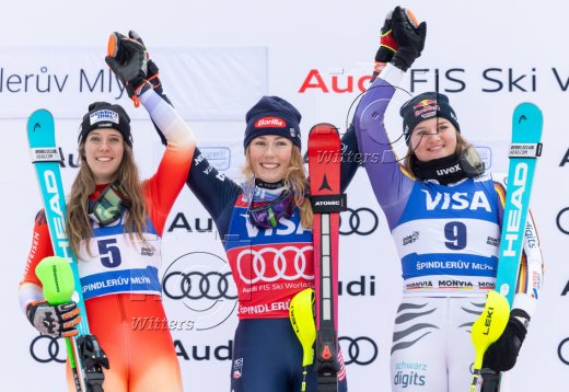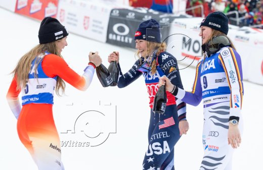 v.l. Camille Rast (Schweiz, 2. Platz), Siegerin Mikaela Shiffrin (USA), Emma Aicher (Deutschland, 3. Platz)