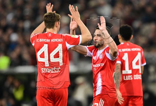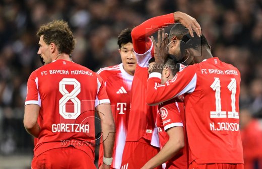 0:5 Tor, Jubel, v.l. Leon Goretzka, Min-Jae Kim, Jonathan Tah, Torschuetze Raphael Guerreiro, Nicolas Jackson (Bayern)
