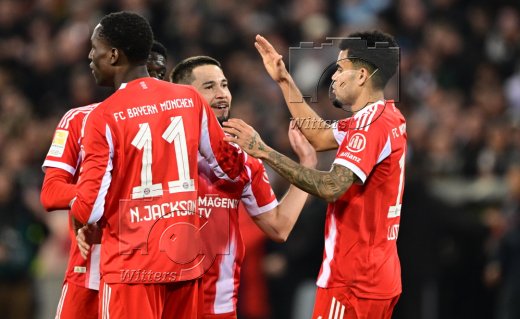 0:5 Tor, Jubel, v.l. Nicolas Jackson, Torschuetze Raphael Guerreiro, Luis Diaz (Bayern)