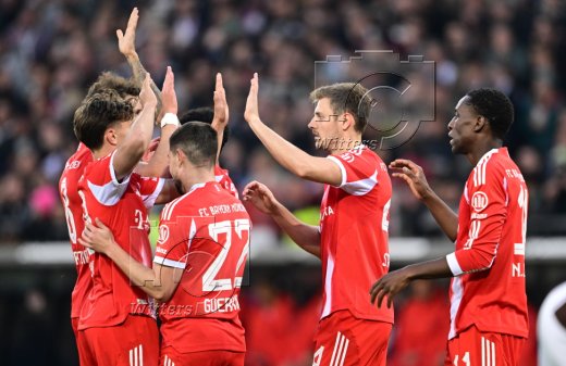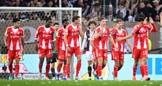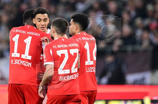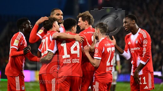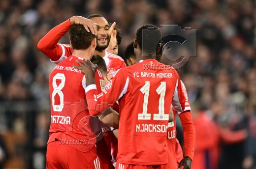 0:4 Tor, Jubel, v.l. Luis Diaz, Torschuetze Nicolas Jackson, Alphonso Davies, Leon Goretzka, Josip Stanisic, Tom Bischof, Jamal Musiala (Bayern)