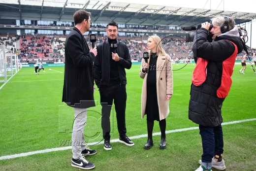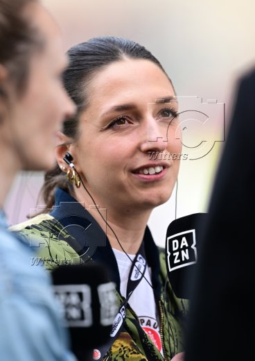 v.l. Moderator Tobias Wahnschaffe (DAZN), Trainer Albert Riera (Frankfurt), TV-Expertin Turid Knaak