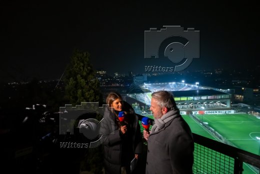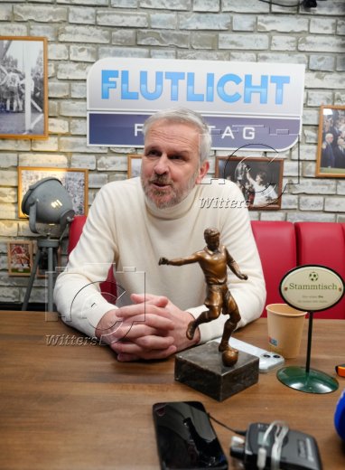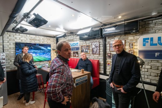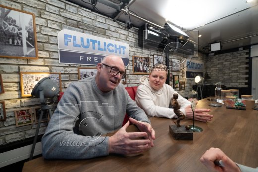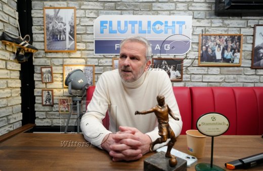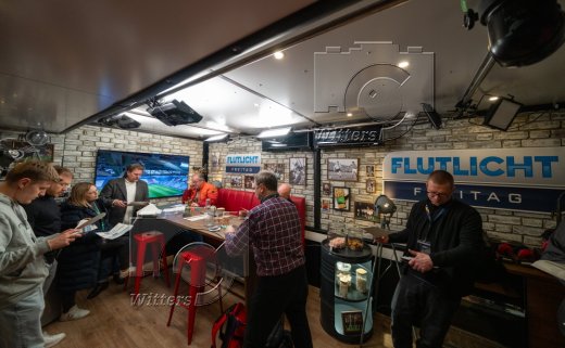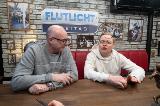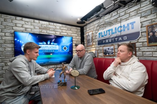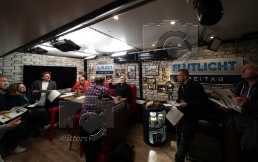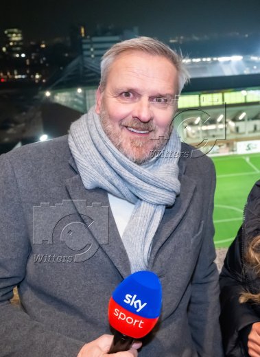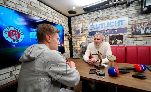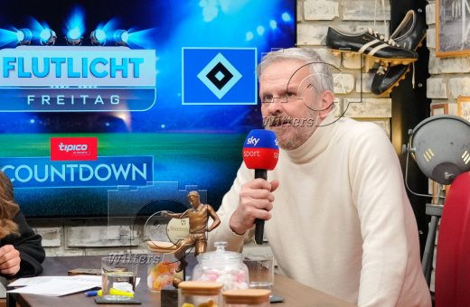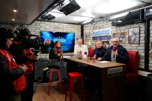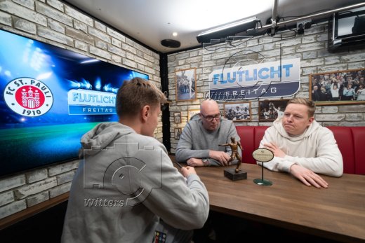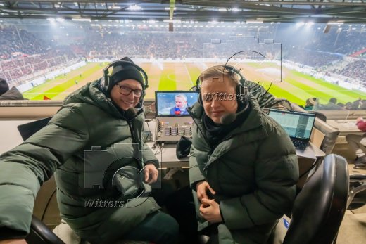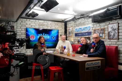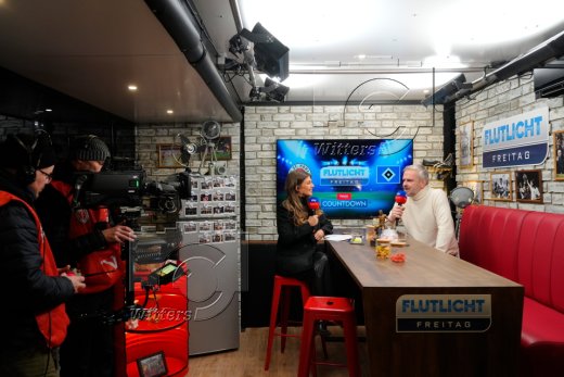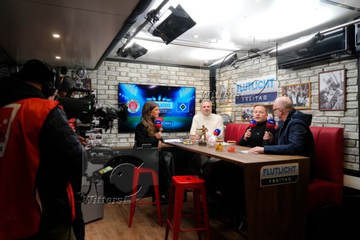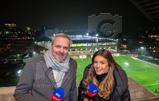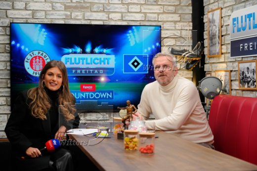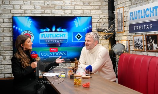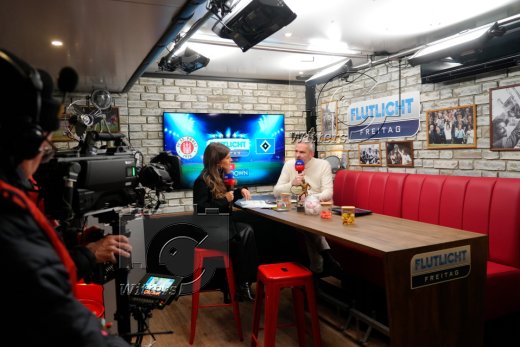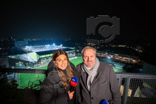 v.l. TV-Experte Dietmar ''Didi'' Hamann, Moderatorin Mara Mones (Sky), Vor dem Millerntor-Stadion auf dem Bunker