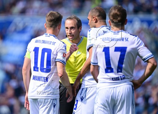 v.l. Marvin Wanitzek (KSC), Schiedsrichter Patrick Alt, Daniel Gordon, Lucas Cueto