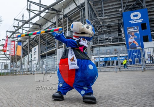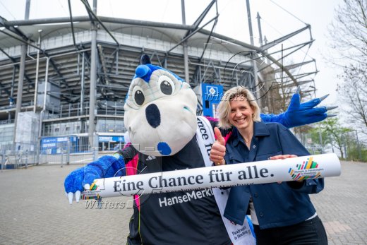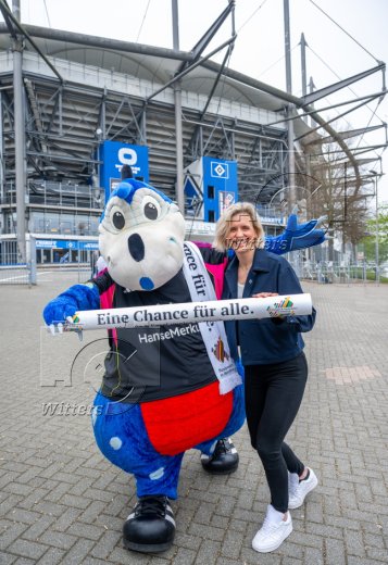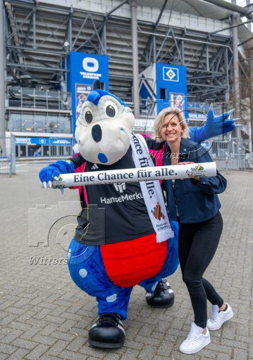 v.l. HSV Maskottchen Dino Hermann, Laura Ludwig (Vizepraesidentin HSV e.V.)
