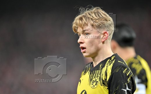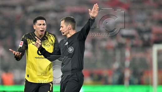 v.l. Jobe Bellingham (Dortmund), Schiedsrichter Robert Hartmann