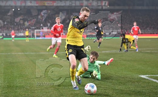 v.l. Maximilian Beier (Dortmund), Torwart Frederik Roennow (Union)