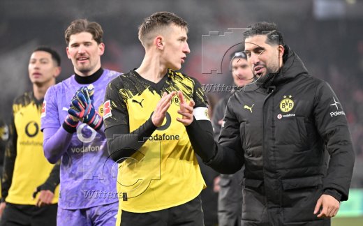 Schlussjubel v.l. Salih Oezcan, Aaron Anselmino (Dortmund)
