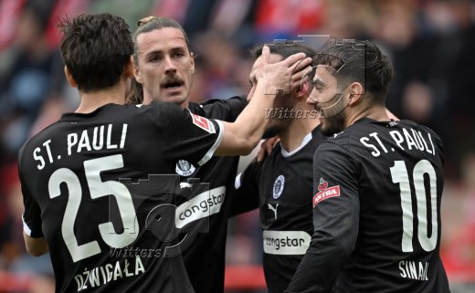 0:1 Tor, Jubel, v.l. Adam Dzwigala, Jackson Irvine, Torschuetze Mathias Pereira Lage, Danel Sinani (St. Pauli)