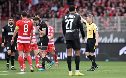 v.l. Rani Khedira, Jackson Irvine (St. Pauli, gelb-rote Karte), Schiedsrichter Tobias Welz