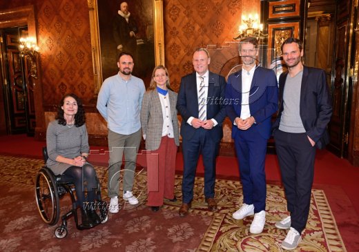 v.l. Sylvia Pille-Steppart (HSB Vizepraesidentin), Daniel Knoblich (Vorstandsvorsitzender Hamburger Sportbund), Juliane Boetel (Vorsitzende HSJ), Andy Grote (Senator fuer Inneres und Sport), Steffen Ruelke (Leitung Vorprojekt Olympische und Paralympische Spiele in Hamburg), Malte Wittmann (Hamburger Sportjugend HSJ, Hanseatic Help)