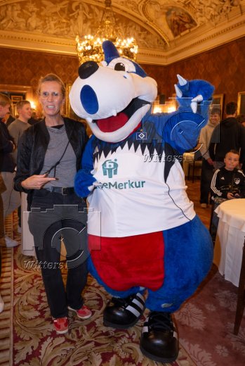 Steffen Ruelke (Leitung Vorprojekt Olympische und Paralympische Spiele in Hamburg) und HSV Maskottchen Dino Hermann