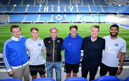 v.l. Claus Costa (Direktor Profifussball HSV), Co-Trainer Loic Fave, Stefan Kuntz (Vorstand Sport, HSV), Trainer Merlin Polzin, Dr. Eric Huwer (Vorstand Finanzen, HSV), Co-Trainer Richard Krohn