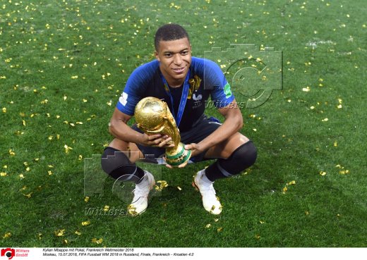 Kylian Mbappe mit Pokal, Frankreich Weltmeister 2018