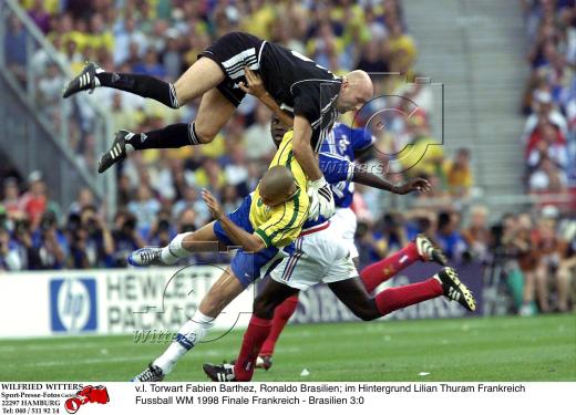 v.l. Torwart Fabien Barthez, Ronaldo Brasilien; im Hintergrund Lilian Thuram Frankreich