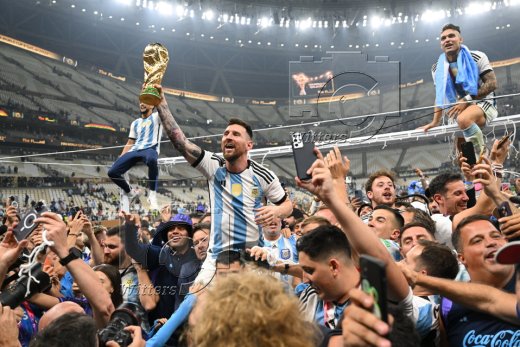 Weltmeister Argentinien 2022, Lionel Messi mit Pokal und Fans