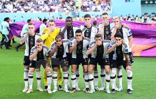 Die Spieler des Teams Deutschland halten sich ihre Haende vor die Muender als Protest gegen Restriktionen der FIFA und als Zeichen fuer Menschenrechte und Meinungsfreiheit, v.l. David Raum, Torwart Manuel Neuer (Deutschland), Antonio Ruediger, Kai Havertz, Niklas Suele, Nico Schlotterbeck, vorn v.l. Joshua Kimmich, Serge Gnaby, Jamal Musiala, Thomas Mueller, Ilkay Guendogan