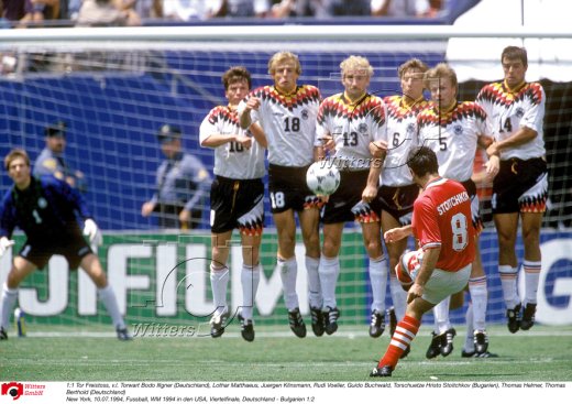 1:1 Tor Freistoss, v.l. Torwart Bodo Illgner (Deutschland), Lothar Matthaeus, Juergen Klinsmann, Rudi Voeller, Guido Buchwald, Torschuetze Hristo Stoitchkov (Bugarien), Thomas Helmer, Thomas Berthold (Deutschland)