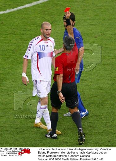 Schiedsrichter Horacio Elizondo Argentinien zeigt Zinedine Zidane Frankreich die rote Karte nach Kopfstoss gegen Marco Materazzi Italien, Gennaro Gattuso