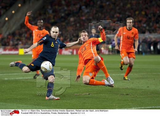 Tor 0.1 v.l. Eljero Elia, Torschuetze Andres Iniesta (Spanien), Rafael van der Vaart, Joris Mathijsen