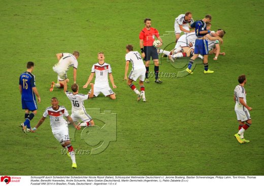 Schlusspfiff durch Schiedsrichter Schiedsrichter Nicola Rizzoli (Italien), Schlussjubel Weltmeister Deutschland v.l. Jerome Boateng, Bastian Schweinsteiger, Philipp Lahm, Toni Kroos, Thomas Mueller, Benedikt Hoewedes, Andre Schuerrle, Mario Goetze (Deutschland), Martin Demichelis (Argentinien, l.), Pablo Zabaleta (3.v.r.)