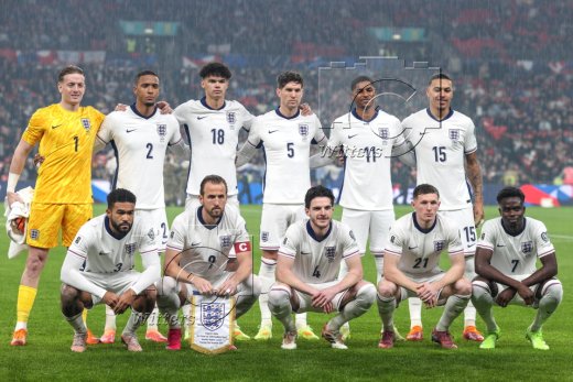 Team England, hinten v.l. Torwart Jordan Pickford, Ezri Konsa, Nico O'Reilly, John Stones, Marcus Rashford, Morgan Rogers, vorn v.l. reece James, Harry Kane, Declan Rice, Elliot Anderson, Bukayo Saka