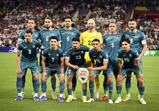 Team Irak, hinten v.l. Ibrahim Bayesh, Akam Hashim, Zaid Tahseen, Torwart Ahmed Basil, Ali Al Hamadi, Ayman Hussein, vorn v.l. Hussein Ali, Youssef Amyn, Merchas Doski, Amir Al Ammari, Aimar Sher