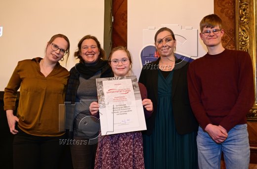 Preistraeger SV Eidelstedt Hamburg von 1880 e.V. ''Inklusives Schwimmen fuer Kinder und Jugendliche mit Handikap'', mit Andy Grote (Senator fuer Inneres und Sport Hamburg), Alexander Otto (Kuratoriumsvorsitzender der Alexander Otto Sportstiftung) und Laudatorin Lisa Altenburg