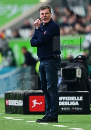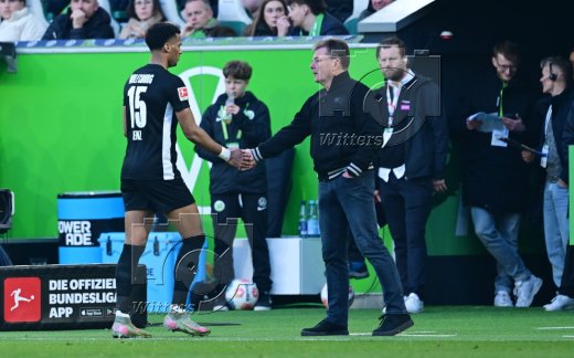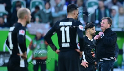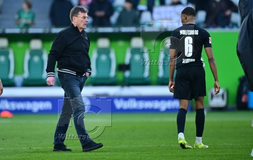 v.l. Moritz Jenz (Wolfsburg) nach gelb-roter Karte, Trainer Dieter Hecking (Wolfsburg)