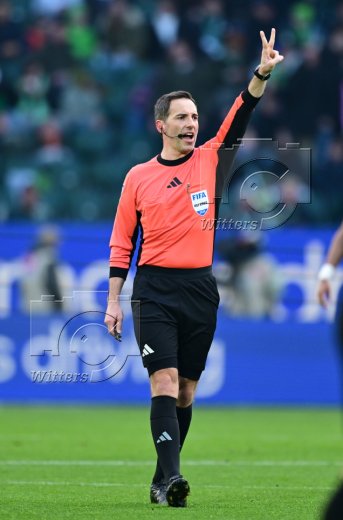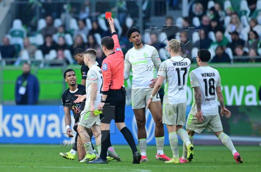 v.l. Moritz Jenz (Wolfsburg, gelb-rote Karte), Jaenuel Belocian, Romano Schmid, Schiedsrichter Benjamin Brand, Salim Musah, Marco Gruell, Cameron Puertas (Bremen)
