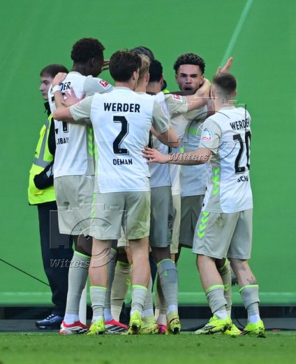 0:1 Tor, Jubel, v.l. Torschuetze Justin Njinmah, Cameron Puertas, Karim Coulibaly, Romano Schmid, Felix Agu, Olivier Deman (Bremen)