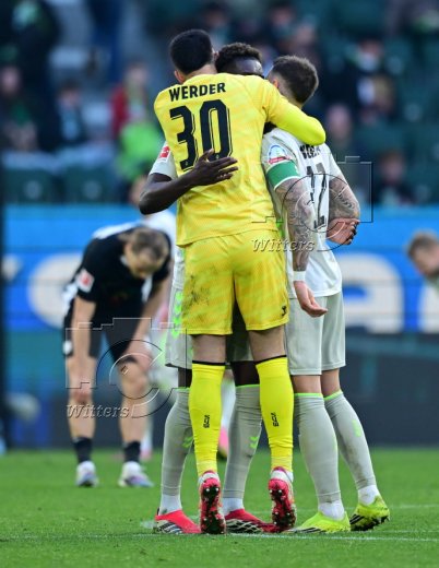 Schlussjubel v.l. Torwart Mio Backhaus (Bremen), Karim Coulibaly, Marco Friedl (Bremen)