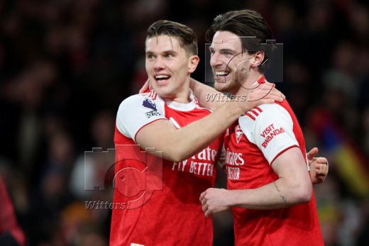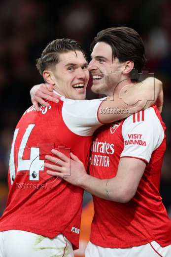 2:0 Tor, Jubel, v.l. Viktor Gyoekeres, Declan Rice (Arsenal) nach Eigentor von Georginio Rutter (Brighton)