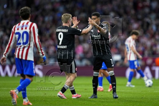 3:0 Tor, Jubel, v.l. Julian Alvarez, Robin Koch, Torwart Kaua Santos (Frankfurt), Arthur Theate, Torschuetze Antoine Griezmann (Atletico)
