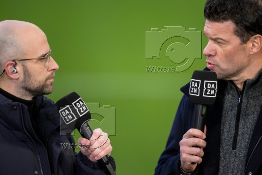 v.l. Moderator Lukas Schoenmueller (DAZN), TV-Experte Michael Ballack