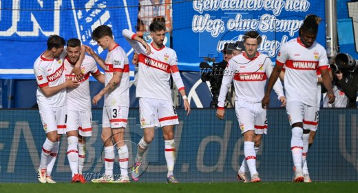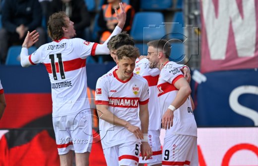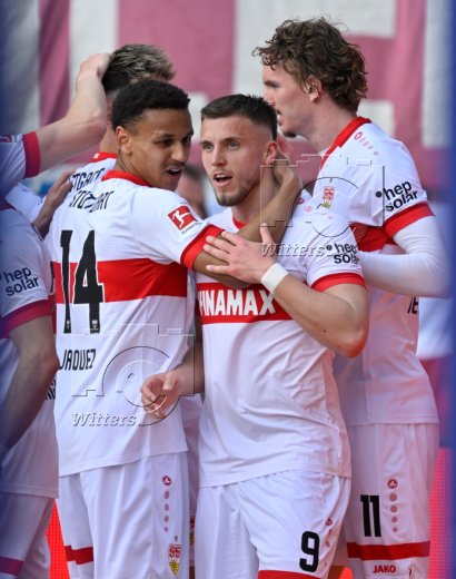 0:1 Tor, Jubel, v.l. Jeff Chabot, Ermedin Demirovic, Ramon Hendriks, Leonidas Stergiou, Fabian Rieder, Nick Woltemade (Stuttgart)